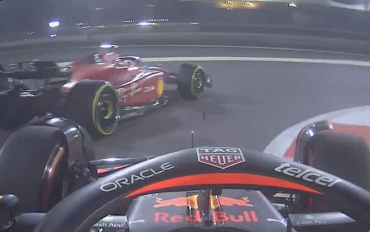 Nella parte finale della seconda giornata di test a Sakhir, duello ruota a ruota tra lo spagnolo della Ferrari e l'olandese della Red Bull. Antipasto del Mondiale, poi Carlos lascia andare Max...