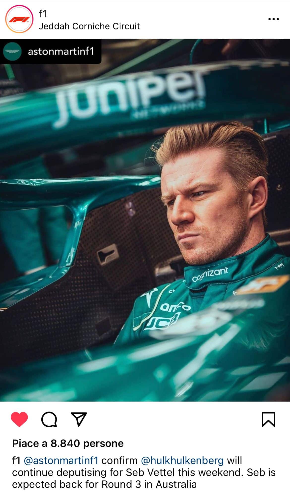 Sebastian Vettel non prenderà parte al GP dell'Arabia Saudita. Il pilota tedesco, risultato positivo al Covid-19 prima del weekend in Bahrain, verrà sositutuito dal connazionale Nico Hulkenberg anche a Jeddah. Seb rientrerà in Australia, dove si correrà la terza gara del Mondiale 2022.