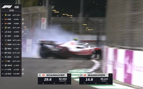 MICK SCHUMACHER, LO SCHIANTO - Saltato l'effetto suolo, si perdono tanti punti di carico e diventa difficile controllare la macchina. Impossibile in questa circostanza per Mick Schumacher: va a muro.