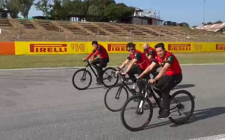 F1, Ferrari: il giro di Leclerc in bicicletta al circuito del Montmeló. VIDEO