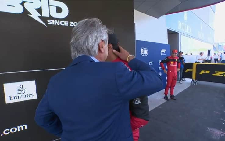 F1, Carlos Sainz senior premia il poleman Leclerc in Spagna e abbraccia il figlio. VIDEO