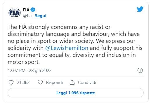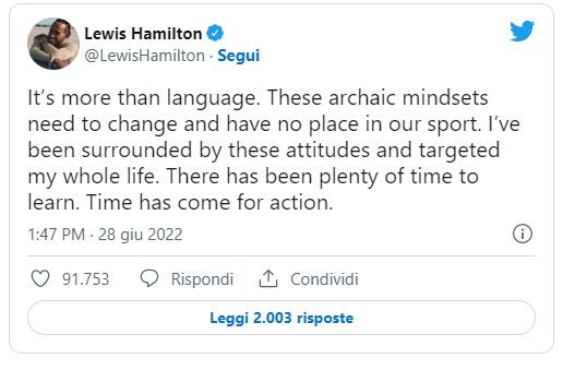 Dopo i comunicati ufficiali di Formula 1 e FIA, sono arrivate anche le parole di Lewis Hamilton sui social alle 13:47: "Non è semplicemente una questione di linguaggio. Queste mentalità arcaiche devono cambiare e non possono trovare spazio nel nostro sport. Sono stato circondato e bersagliato da questi atteggiamenti per tutta la mia vita. Abbiamo avuto molto tempo per imparare, adesso è arrivato il momento di agire. Concentriamoci su un cambiamento di mentalità".