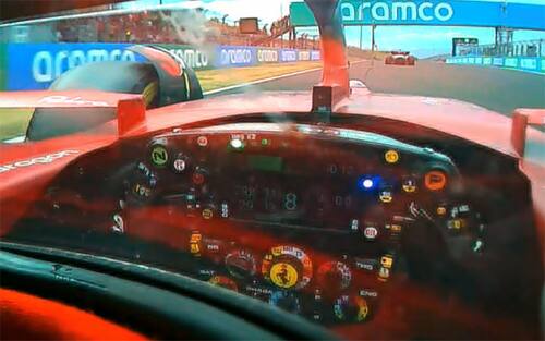 GIRO 22 - Leclerc viene chiamato ai box e monta gomma gialla: il monegasco esce in seconda posizione davanti al compagno Sainz