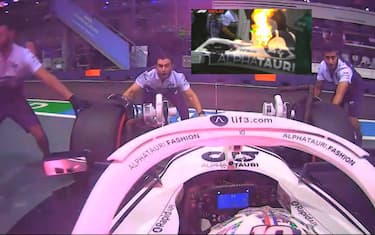 Questa l'impressionante sequenza vista dalla macchina di Gasly. Da notare l'espressione terrorizzata e stupita dei meccanici AlphaTauri
