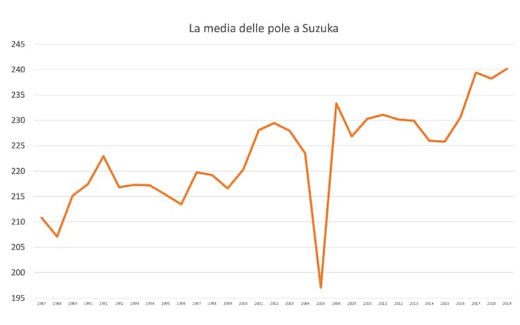 Ebbene, in tutti i giri corsi a Suzuka tra qualifiche e gare, è l’unico che superi la media di 240 all’ora, muro che sembrava un tabù sulla pista giapponese. Nel 2017 infatti Hamilton si fermò a 239,411 km/h e nel 2018 a 238,208.