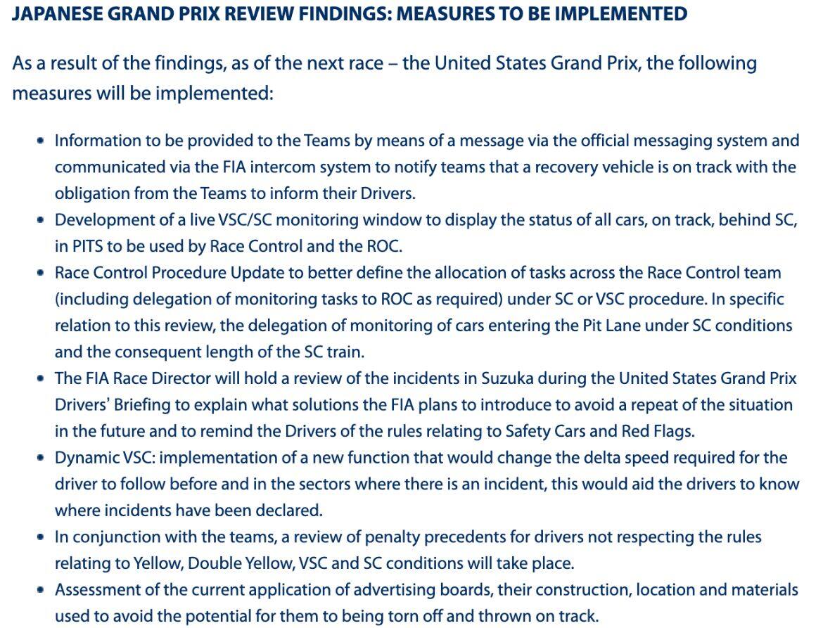 - Il direttore di gara terrà una revisione degli incidenti di Suzuka durante il briefing con i piloti nel Gran Premio degli Stati Uniti per spiegare quali soluzioni la FIA intende introdurre per evitare che situazioni simili si ripetano in futuro e per ricordare ai piloti le regole relative alle Safety Car e alle bandiere rosse.