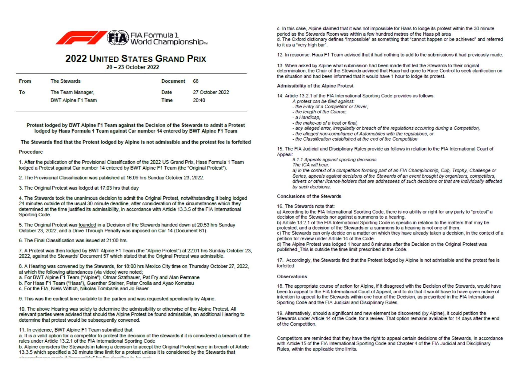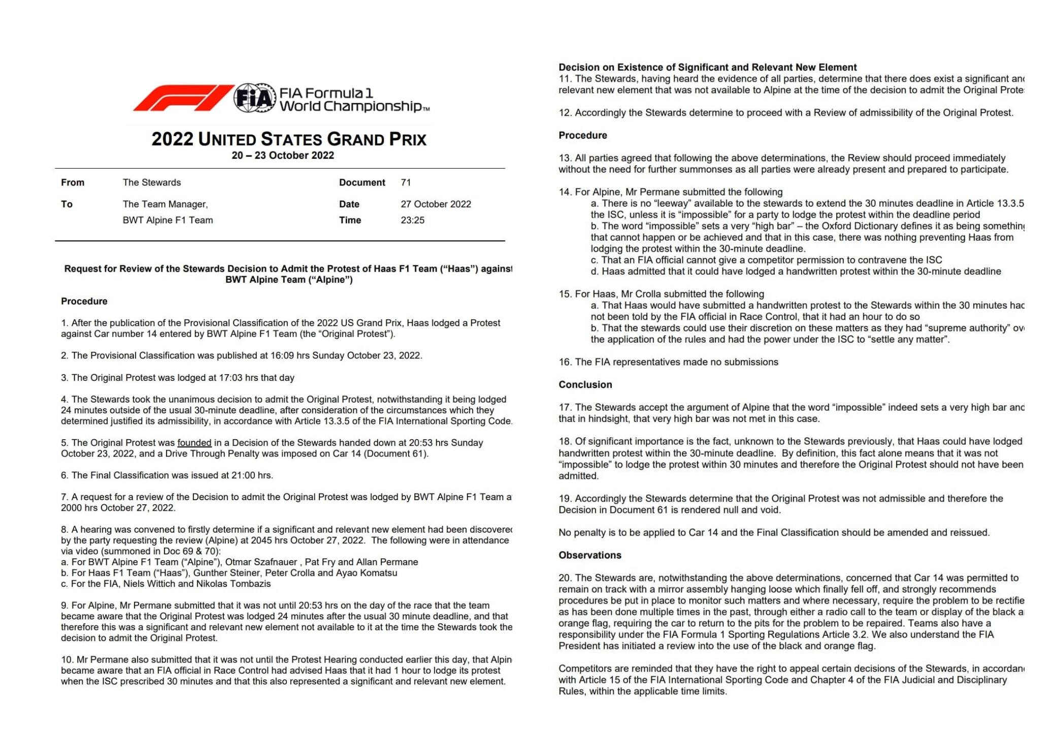 La questione non si è chiusa dopo la che la Federazione respinto il tentativo di Alpine di ribaltare la penalità di Alonso. Il team francese ha infatti chiesto una revisione dell'ultima decisione e ottenuto un ribaltamento con l'appello: via la penalità ad Alonso, lo spagnolo riottiene il settimo posto ad Austin. Con la protesta ritenuta ammissibile, giovedì sera si è svolta un'altra udienza in Messico dove è stato accertato che Haas in Texas avrebbe potuto presentare una protesta entro il termine di 30 minuti, il che significa che non era impossibile soddisfare quanto stabilito dal regolamento. Quindi che la protesta iniziale non era ammissibile ed è diventata nulla, ripristinado l'ordine di arrivo della gara al COTA.