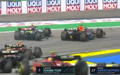 - Ci risiamo, come un anno fa torna la lotta tra Verstappen e Hamilton. Alla S di Senna, subito dopo la ripartenza, i due vanno a contatto. Dopo l'investigazione, i commissari hanno inflitto 5 secondi di penalità al campione del mondo in carica