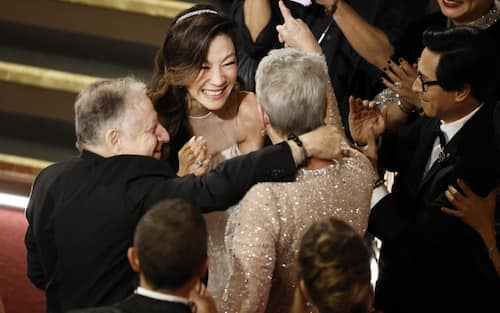 - Ed eccola Michelle Yeoh con la statuetta. Per lo stesso film si era già aggiudicata il Golden Globe come miglior attrice in un film commedia o musicale