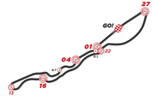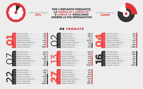 - La più dura per l’impianto frenante è la curva 27 (l'ultima) perché le monoposto vi arrivano dopo aver frenato per l’ultima volta alla curva 22.