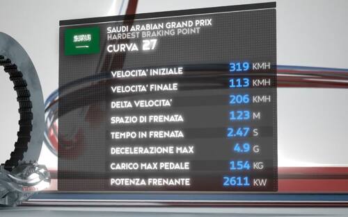 - Delle 8 frenate del GP Arabia Saudita 4 sono considerate altamente impegnative per i freni, 2 sono di media difficoltà e le 2 restanti sono light