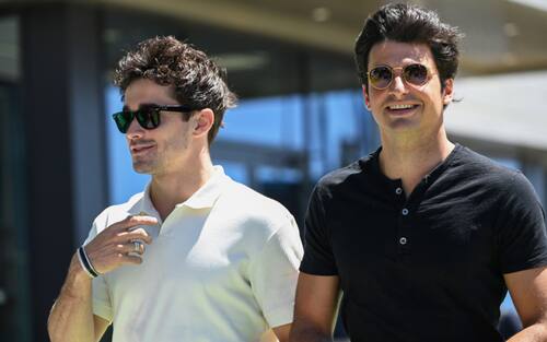 - Uno accanto all'altro i piloti ferraristi Leclerc e Sainz. Per il primo si preannuncia una gara in salita dopo la penalità per la sostituzione della centralina