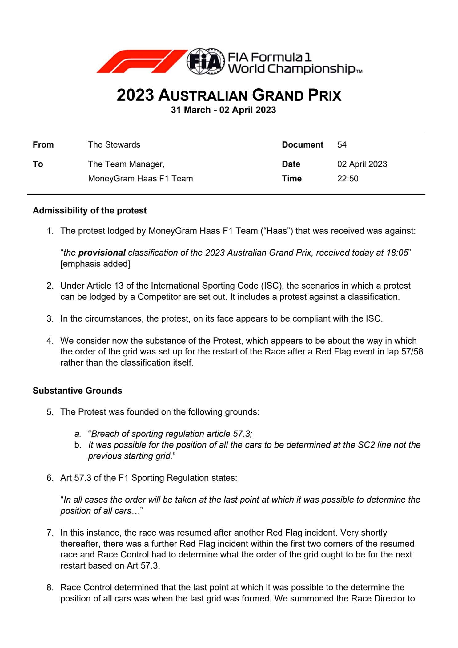I commissari hanno affermato l’impossibilità di rilevare in modo certo l’ordine delle monoposto nei punti intermedi lungo la pista prima della nuova esposizione di bandiera rossa. Di questo parla l'articolo 57.3 del Codice Sportivo. Non solo. E' stato altresì ritenuto non affidabile l’uso del GPS proposto dal team nella protesta (indicato al punto 10 nel comunicato sottostante) per determinare la posizione delle vetture (come da regolamento). Pertanto, al fine di stabilire l'ordine della partenza del 58esimo giro, nell'interesse di far ripartire il gran premio in maniera più rapida possibile, si è tornati alla classifica della seconda ripartenza.