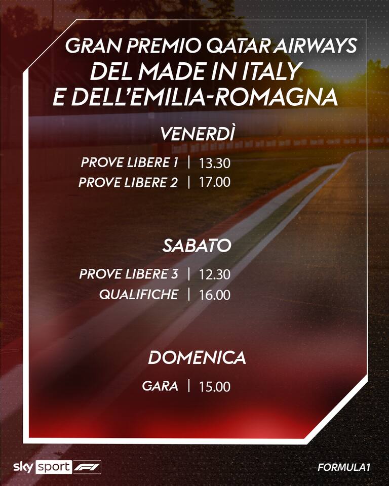 Siamo nella settimana che porta all'atteso GP dell'Emilia Romagna e del Made in Italy. In questo weekend, all'Autodromo Enzo e Dino Ferrari, si correrà il sesto gran premio della stagione 2023. Qui le curiosità e tutto quello che c'è da sapere sulla gara di Imola, a cominciare dagli orari per non perdere nessuno degli appuntamenti in diretta su Sky. Si parte giovedì con la conferenza piloti in Live Streaming alle 14.30 su Skysport.it