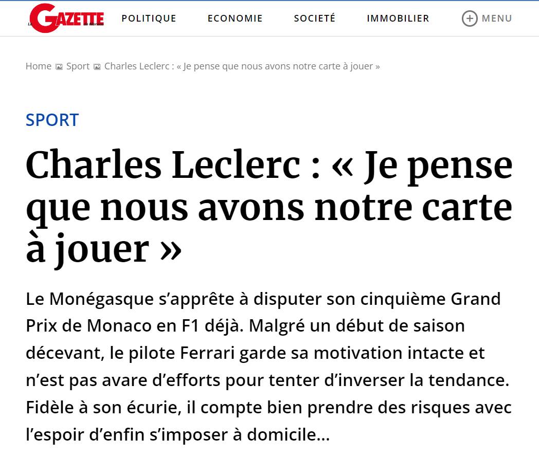Le voci sul futuro di Charles Leclerc sono un argomento frequente al paddock del Mondiale. Anche alla vigilia del suo GP di casa, a Monaco. Leclerc ne ha parlato in un'intervista a La Gazette de Monaco: "Non ho intenzione di commentare, ma è vero che è una novità nella mia carriera. Finora non ero stato oggetto di voci. Sono arrivato in F1 all'Alfa Romeo senza che ci fosse nessuna chiacchiera o segnale, poi con sorpresa di tutti sono stato annunciato alla Ferrari. Da allora non ci sono mai stati davvero dubbi, perché ho un lungo contratto con la Scuderia che scade alla fine del prossimo anno. Amo la Ferrari, ho sempre sognato di correre per questa squadra. Le voci non mi toccano molto e cerco soprattutto di concentrarmi su quello che c'è da fare in pista, perché non siamo ancora al livello in cui vorremmo essere".