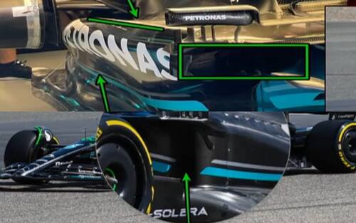 - Sulle pance Mercedes non ha osato qualcosa di più estremo perché bloccati dai coni anti-intrusione per modificare la posizione. Cosa che avrebbe imposto nuovi crash test e un nuovo telaio. Ciò detto sono comunque riusciti a cambiare la conformazione delle pance e quindi a convogliare i flussi al posteriore opposta rispetto a prima.