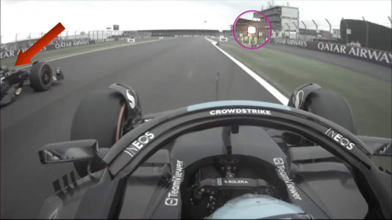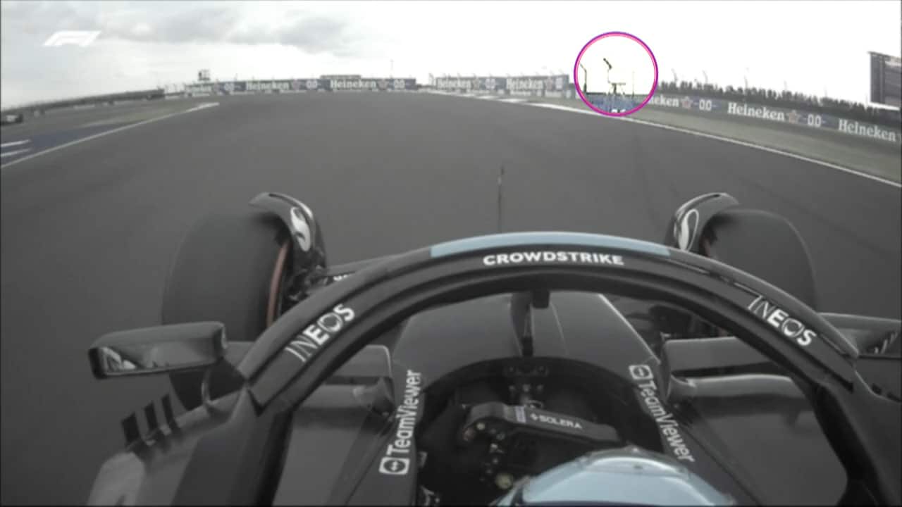 - Successivamente un altro pannello, che invece è giallo. Qui Versatppen compie il sorpasso prima di arrivare al marshall post, quindi prima della bandiera. Ecco perché il suo sorpasso è regolare. La domanda è perché di questa alternanza nei pannelli quando in quella zona non c'erano incidenti. Non solo: alcuni piloti sul volante avevano il led acceso e altri spento.