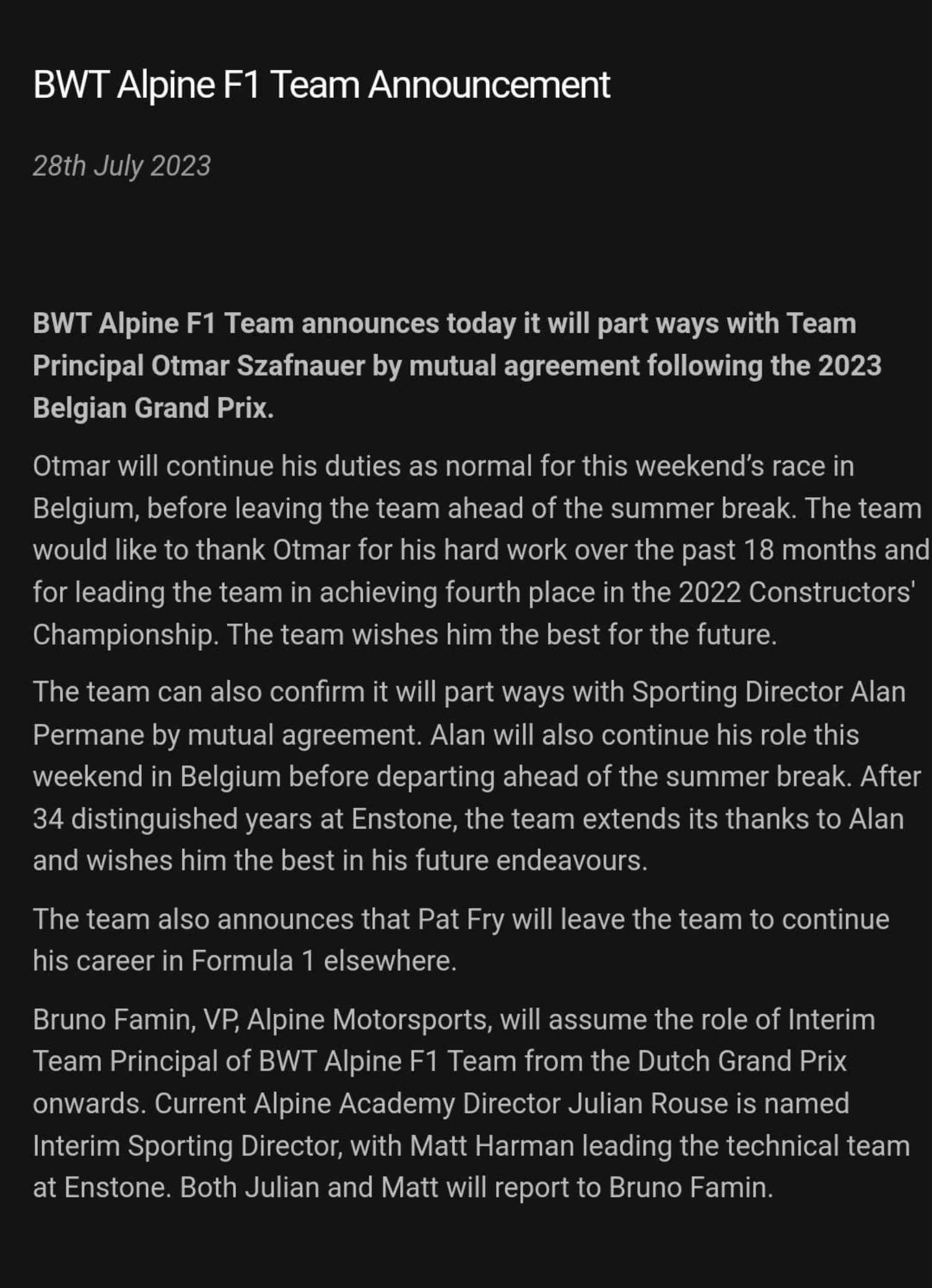 Otmar Szafnauer è più il team principal dell'Alpine. Il piovoso weekend del Belgio fa da cornice all'addio del manager americano sul quale la Casa francese ha deciso di non puntare più. Una decisione non del tutto inaspettata nell'abito del processo di cambiamento avviato da Alpine che sceglie temporaneamente il vice presidente Bruno Famin per sostituire temporaneamente Szafnauer. Quest’Ultimo paga i risultati e un inizio di stagione ben al di sotto delle aspettative, ma su di lui grava anche la mancata conferma di Fernando Alonso poi passato all'Aston Martin. L'Alpine ha inoltre annunciato anche l'addio dello sporting director Alan Permane. Infine, per il dopo Szafnauer c'è un'ipotesi, al momento solo una voce, che vorrebbe tra i nomi anche quello dell'ex team principal della Ferrari Mattia Binotto.