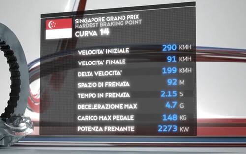 - Dalla partenza alla bandiera a scacchi, a Singapore ogni pilota esercita un carico totale sul pedale del freno di quasi 105 tonnellate e mezza: primato stagionale. D’altro canto in 9 frenate si superano i 100 kg con decelerazioni di almeno 3,4 g per ciascuna di queste staccate: valori importanti che richiedono una resistenza e una muscolatura non comuni.