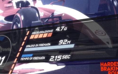 - La frenata più impegnativa è alla curva 14: le monoposto passano da 289 a 90 km/h in 2,28 secondi in cui percorrono appena 96 metri.