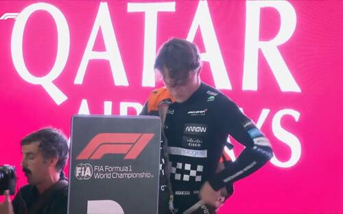 - Al termine della gara, Norris, Verstappen e Piastri, in attesa delle interviste, si tolgono la tuta e si bagnano la testa con l'acqua