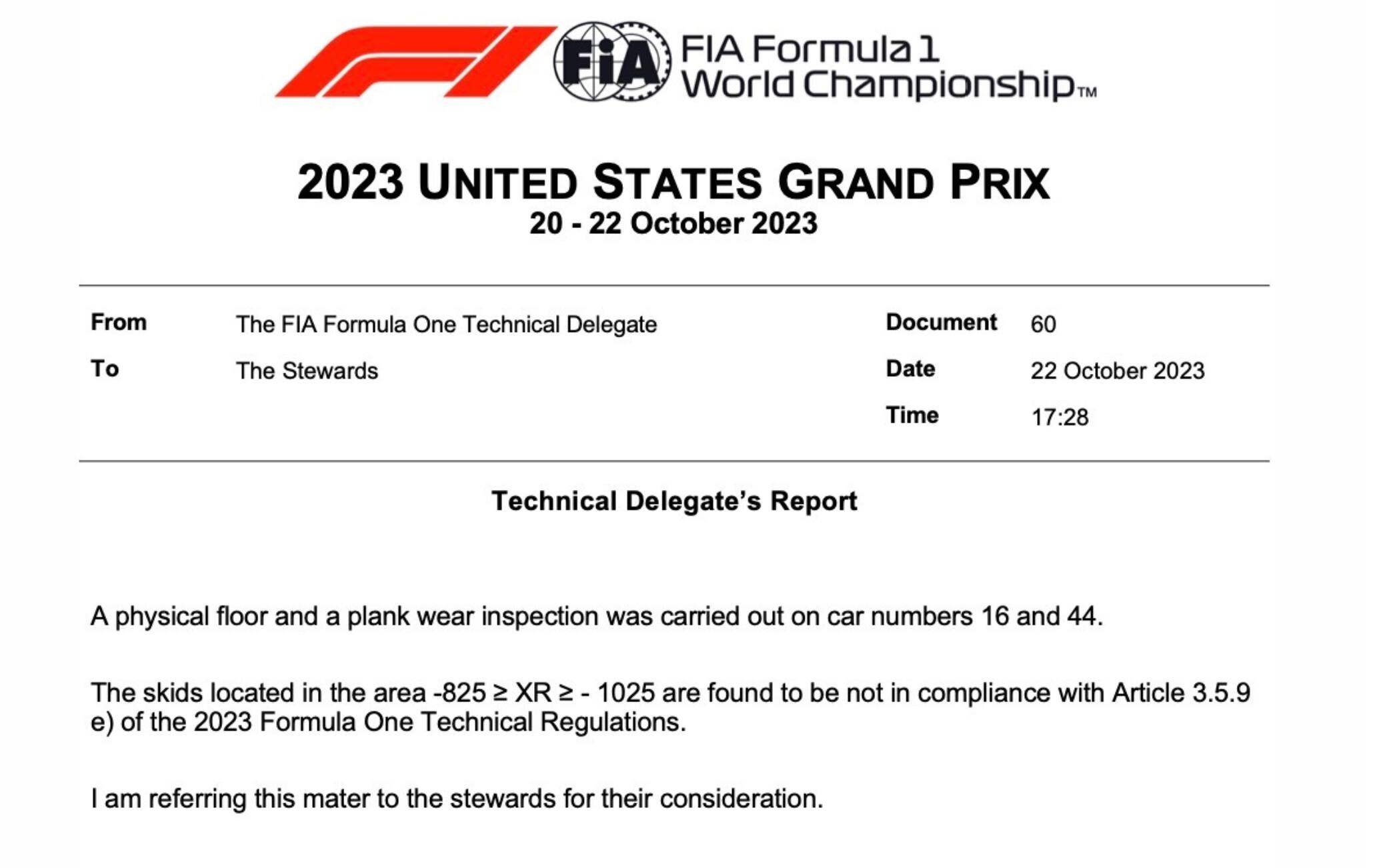 Un post Gran Premio degli Stati Uniti con un colpo di scena: squalificati Lewis Hamilton e Charles Leclerc, con Sainz che va sul podio dopo la sanzione al britannico della Mercedes. Ma cosa è successo? La FIA ha diramato dopo la gara un comunicato sulla presunta - fino a quel momento - inosservanza del regolamento da parte di due monoposto, appunto la Ferrari di Charles Leclerc e la Mercedes di Lewis Hamilton. Irregolarità relative al fondo delle macchine che la nota a firma di Joe Bauer (The FIA Formula One Technical Delegate) ha spiegato così: "Sulle vetture numero 16 e 44 è stato effettuato un controllo del pavimento (fondo) e al pattino (plank). Gli skids ( parti metalliche poste sul pattino, ndr) nella zona -825 ≥ XR ≥ - 1025 risultano non conformi all'Articolo 3.5.9 e) del Regolamento Tecnico di Formula 1 2023. Riferisco la questione agli steward per le loro considerazioni".