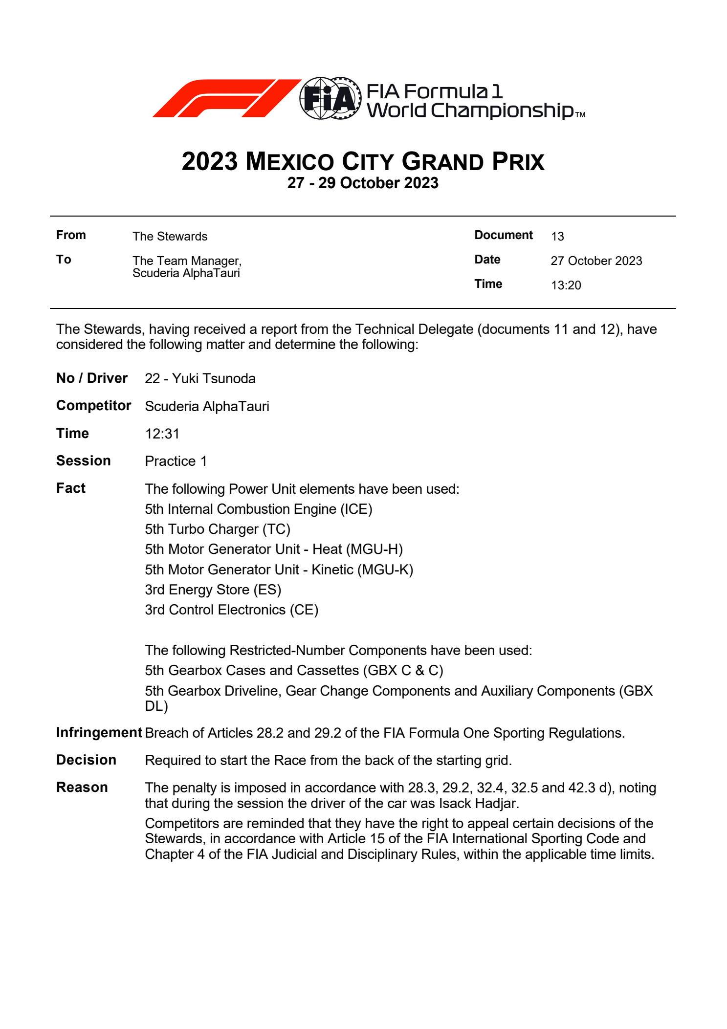 Yuki Tsunoda partirà dal fondo della griglia nel Gran Premio del Messico dopo la penalità inflitta a causa di modifiche alla sua vettura nelle prime libere, inclusa una nuova Power Unit. Il giapponese ha sostituito sulla sua AlphaTauri tutte le componenti del motore e del cambio. In particolare Tsunoda ha cambiato sulla sua monoposto: