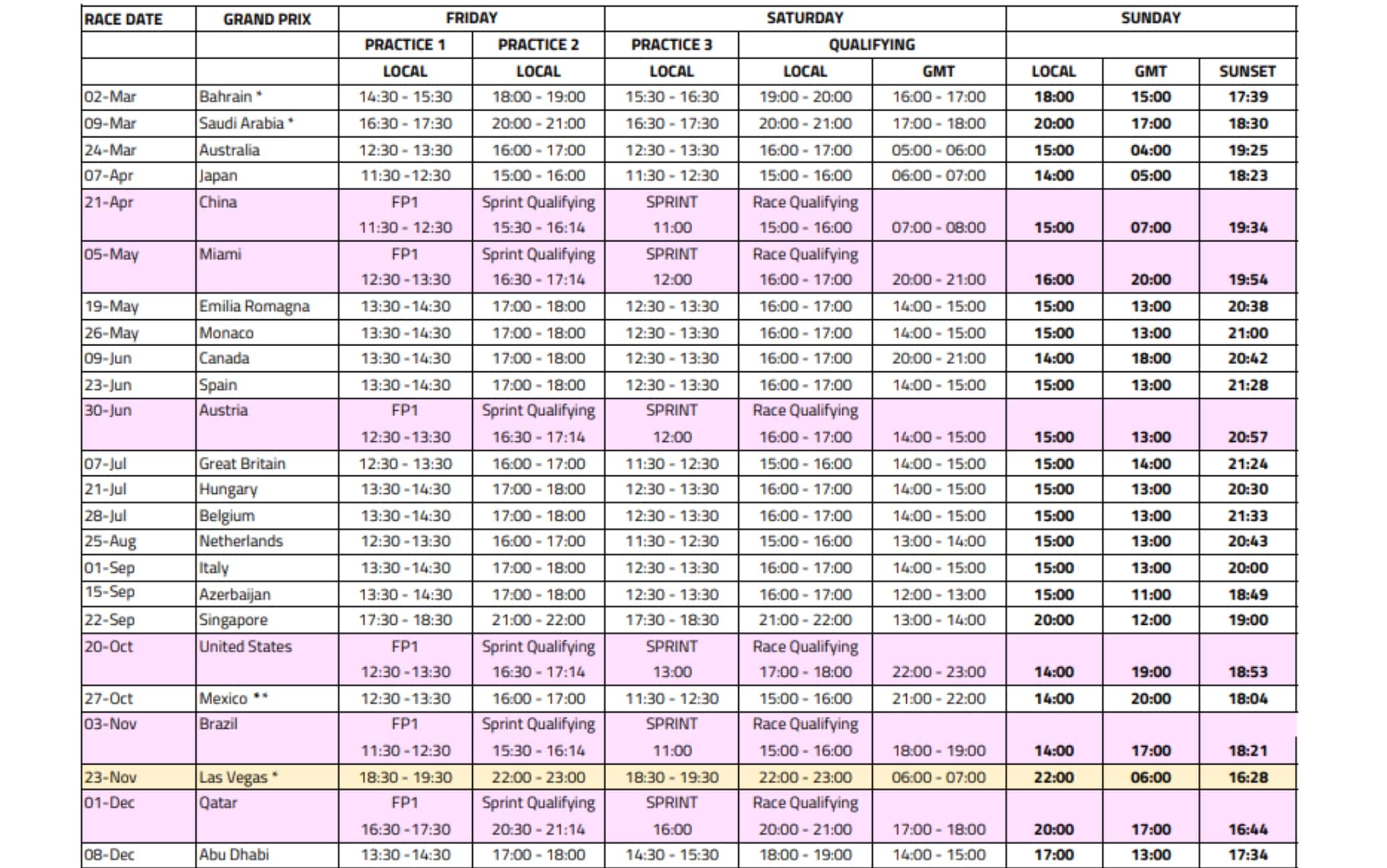 Ufficializzati tutti gli orari dei weekend di Formula 1. Il Mondiale scatta il 2 marzo con la gara delle 16 in Bahrain, si tratta di un sabato. Stesso giorno in cui si correrĂ in Arabia Saudita per rispettare il Ramadan. Anticipato il via del GP di Melbourne rispetto al 2023, posticipato quello di Miami. Qui anche gli orari delle gare Sprint. Tutto il campionato sarĂ LIVE su Sky e in streaming su NOW