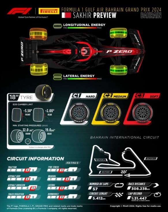Pirelli ha nominato per il Gran Premio del Bahrain la mescola C1 come P Zero White hard, C2 come P Zero Yellow medium e C3 come P Zero Red soft.