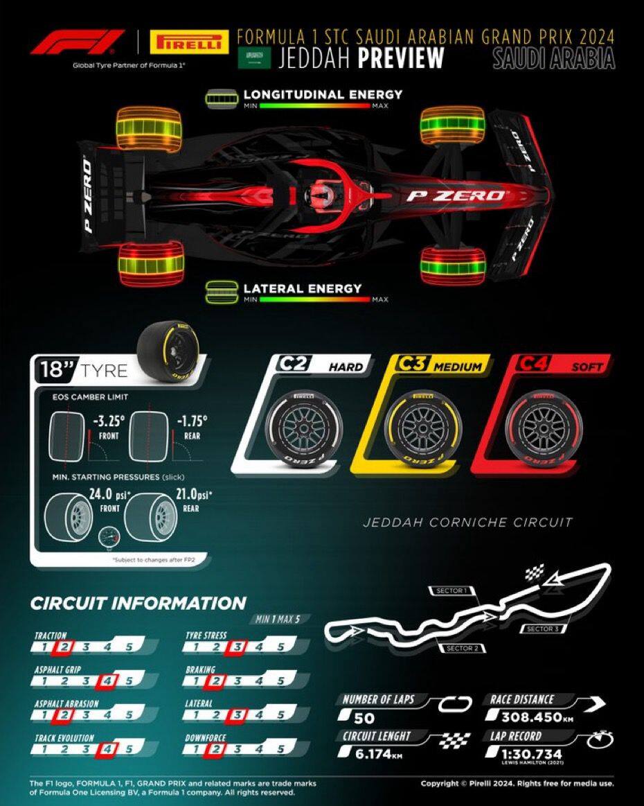 Pirelli ha scelto per il Gran Premio d’Arabia Saudita la gamma C2, C3 e C4, in linea con la scelta dei primi tre anni dell'evento, così come la pressione scelta che ha valori similari a quelli del 2023 dopo l’incremento effettuato da Pirelli in seguito ai dati raccolti il venerdì. Il degrado non è un fattore importante in gara, e ci si può attendere una strategia a una sosta che negli altri anni prevedeva l'inizio di gara sulle medie per poi montare le dure. I punti di sorpasso principale sono curva 27, l'ultima, e curva 1, ma dal secondo giro sarà possibile attivare il DRS e le battaglie potrebbero nascere molto presto, così come dei trenini DRS che compatterebbero la griglia rendendo difficile trovare il momento ideale per la prima sosta dei top team. L'asfalto liscio e poco abrasivo del circuito di Gedda lo rende molto diverso da quello del Bahrain, e anche in questo senso vedremo dei riscontri diversi rispetto a settimana scorsa; sarà più facile abbassare l'altezza da terra della vettura e potremo vedere vetture più vicine al suolo. Essendo un circuito cittadino l'evoluzione della pista sarà importante e il rischio di Safety Car è elevato, e le bandiere rosse non sono mancate negli ultimi anni, per cui anche la fortuna potrebbe giocare un ruolo importante sabato.