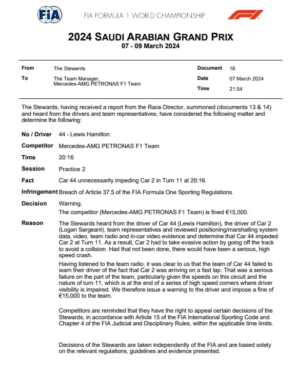 gp arabiaImpeding di Hamilton nei confronti di Sargeant durante la seconda sessione di prove libere in Arabia Saudita. Il britannico si stava spostando per far passare Sainz e non vede arrivare Sargeant alle sue spalle con l'incidente evitato per un soffio. L'episodio è stato investigato: warning per Lewis e multa alla Mercedes. Tutto il weekend live su Sky e in streaming su NOW