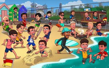 - Spettacolare questa copertina pubblicata sui social della F1. I piloti in versione cartoon e in spiaggia, tra surf e onde