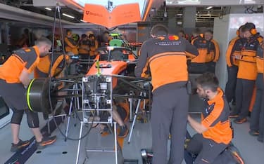 Non c'è pace per il team campione del mondo: macchina di Norris sui cavalletti prima e durante la...