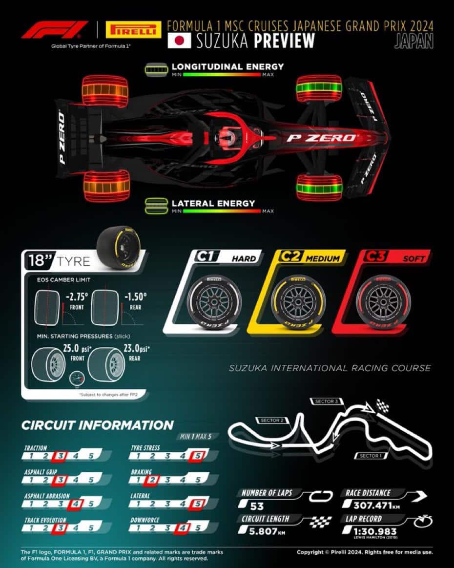 Suzuka offrirà diverse sfide interessanti per ingegneri e piloti: la natura molto veloce del tracciato richiede un buon livello di carico aerodinamico ma un compromesso troppo mirato sulle curve a media e alta velocità rischia di far perdere troppo tempo nelle curve a bassa velocità, che sono il tornantino del settore centrale e l’ultima chicane. Questo è quello che è successo lo scorso Settembre, quando Max Verstappen ha dominato specialmente nelle due curve più lente del circuito nei 53 giri di domenica.