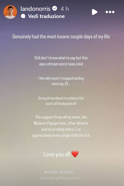 SU INSTAGRAMIl pilota della McLaren ha commentato su Instagram la prima vittoria in Formula 1, conquistata a Miami, nel suo 110° Gran Premio: "Ho trascorso i due giorni più folli della mia vita. Non ho smesso di sorridere dal giro 33. E dopo tutto questo, abbiamo appena iniziato". La storia di Lando Norris
