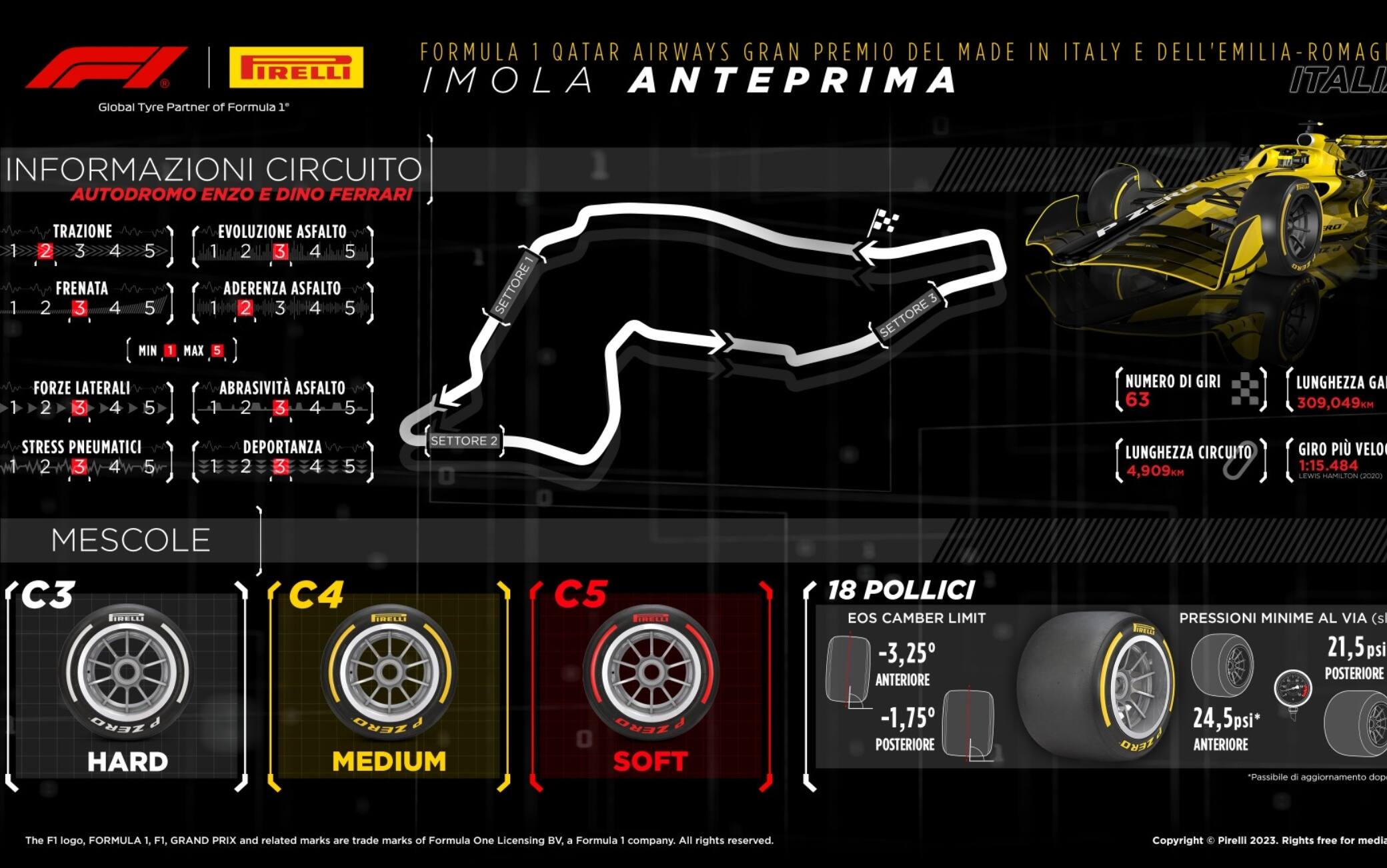 Il meteo promette asciutto, ma le possibilità di qualche rovescio nel corso del fine settimana ci sono e potrebbero scombinare le carte rendendo il GP di Emilia Romagna ancora più imprevedibile. La qualifica giocherà un ruolo fondamentale vista la difficoltà nei sorpassi, e la probabile strategia a una sosta dettata dal fatto che il tempo perso nella pit lane di Imola è il più alto di tutto il calendario. Pirelli ha scelto le mescole più morbide, la C3, C4 e C5 per il fine settimana, uno step più morbido rispetto alla scelta di due anni fa quando la pioggia aveva influenzato la gara non dando riferimenti sui 63 giri di domenica ma la gara a una sosta è l'opzione più probabile a meno di gravi problemi di degrado. Il tracciato è cambiato in alcune vie di fuga, con ghiaia immediatamente dopo i cordoli che punirà eventuali errori e segneranno limiti della pista naturali senza doversi affidare alla tecnologia che ha spesso fatto discutere negli ultimi anni qui a Imola.