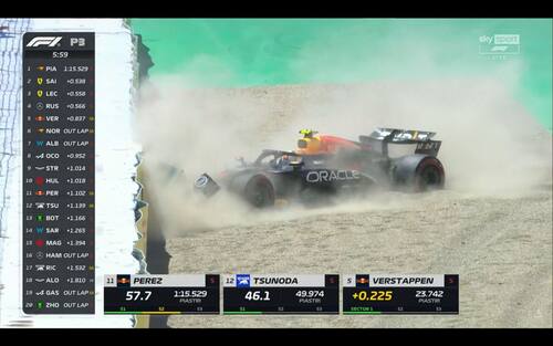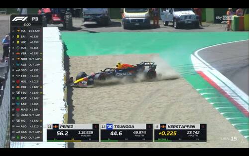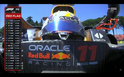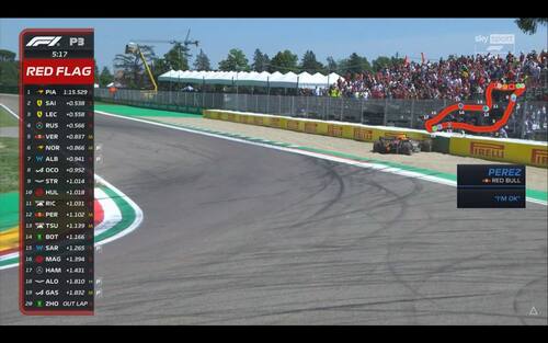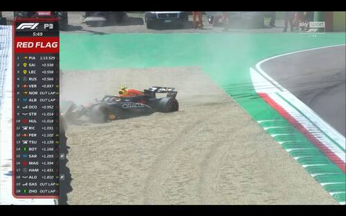 Altro incidente nelle FP3 a Imola: dopo Alonso, anche Perez va in ghiaia e a muro nella variante Gresini a 5 minuti dal termine della sessione. La Red Bull del messicano non ha riportato danni gravi. Tutto il fine settimana del GP del Made in Italy e dell'Emilia Romagna è live su Sky e in streaming su NOW