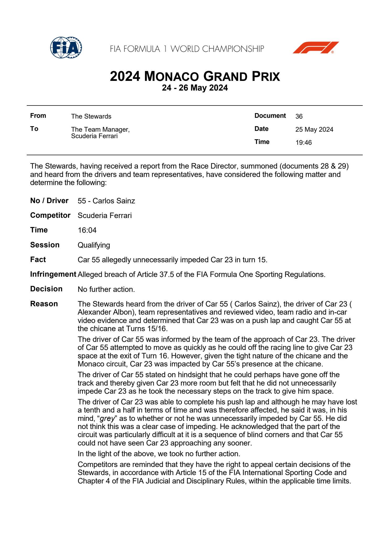 gp monacoNessuna penalità per Carlos Sainz, che era finito sotto investigazione per impeding su Albon. Lo spagnolo, terzo al termine delle qualifiche del GP di Monaco, era stato convocato dai commissari con il pilota della Williams per un episodio accaduto in Curva 15 nel corso del Q1, ma è stato scagionato. Il GP Monaco è live su Sky e in streaming su NOW