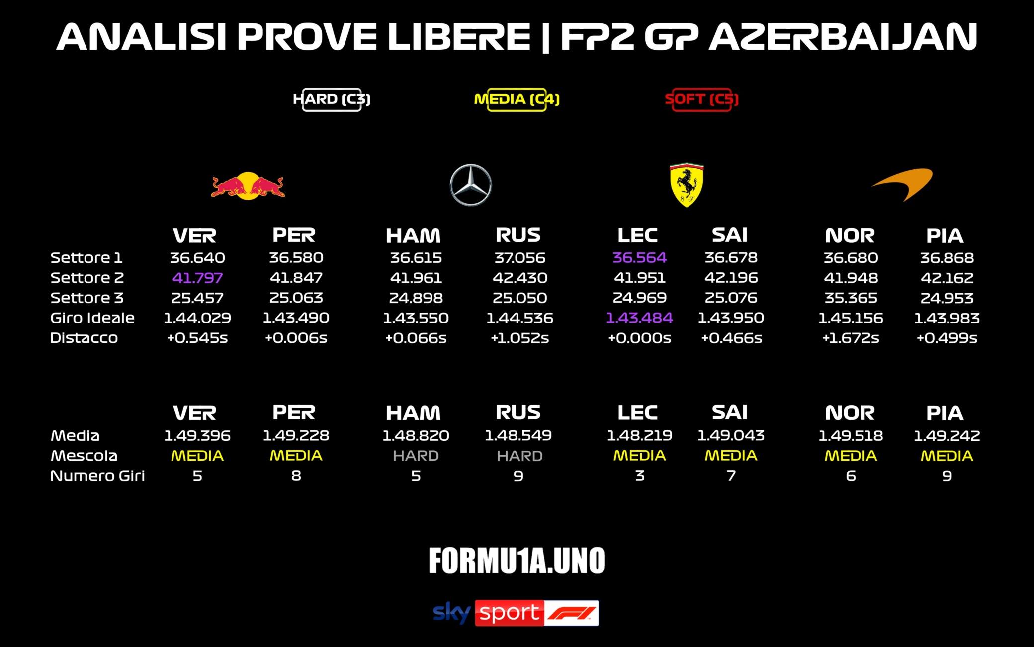 Il tracciato cittadino di Baku ha lasciato molti dubbi sui valori in campo delle squadre in Azerbaijan dopo la prima giornata di azione: i bassi livelli di grip visti ieri promettono una grande evoluzione di pista e gli assetti si dovranno adattare a questo cambiamento, tuttavia si può pensare a una lotta per pole e vittoria molto compatta. Nonostante i problemi che hanno limitato i giri di Leclerc in FP2, è stato il monegasco a far segnare il miglior tempo nonostante i pochi giri di esperienza con il circuito azero: Ferrari è stata competitiva sia nel giro singolo che nelle brevi simulazioni di passo gara svolte a fine giornata. Sorprende in particolare Red Bull, arrivata con delle modifiche al fondo e alla chiglia del diffusore, su un circuito che si pensa possa mettere in difficoltà la RB20: i risultati di oggi e domani daranno prova di eventuali passi in avanti.