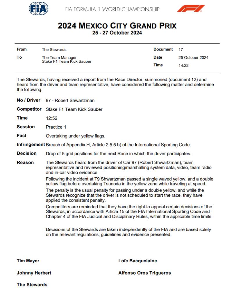GP MESSICOIl pilota dell'Academy Ferrari, che ha girato con la Kick Sauber nella prima sessione di libere al 'Rodriguez', è stato penalizzato con 5 posizioni in griglia per "sorpasso durante il regime di bandiera gialla". Essendo sceso in pista al posto di Zhou solo per le FP1, sconterà la sanzione nella successiva gara alla quale prenderà parte. Tutto il weekend di Città del Messico è live su Sky e in streaming su NOW