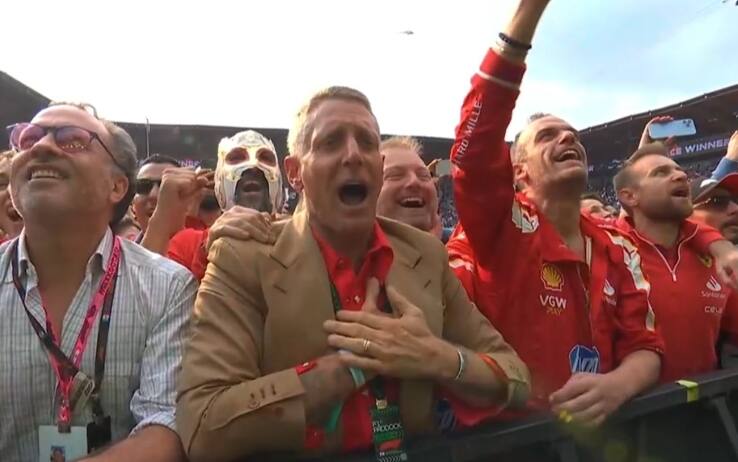 Tutta la gioia del team Ferrari che canta a squarciagola l'Inno dopo il successo di Carlos Sainz in Messico. E tra i meccanici c'è anche un emozionato Lapo Elkann. Il Mondiale torna la prossima settimana in Brasile: live su Sky e in streaming su NOW