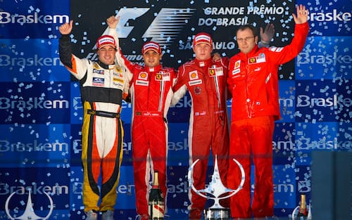 - Interlagos fu una beffa, nonostante la vittoria. Al termine dell'anno Felipe è secondo, a un punto da Hamilton. Cruciale fu il sorpasso dell'inglese ai danni di Glock a tre curve dal termine dell'ultimo GP, proprio quando in Ferrari si festeggiava...