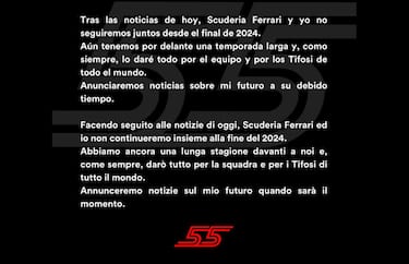Alla notizia dell'ingaggio di Hamilton, fa seguito la risposta sui social da parte dello stesso Sainz: "Scuderia Ferrari ed io non continueremo insieme alla fine del 2024. Abbiamo ancora una lunga stagione davanti a noi e, come sempre, darò tutto per la squadra e per i tifosi di tutto il mondo. Annunceremo notizie sul mio futuro quando sarà il momento". Come ha ammesso Sainz, a pochi giorni dall'ultimo GP della stagione ad Abu Dhabi: "La sensazione di quella telefonata a fine gennaio in cui mi è stato detto che non sarei rimasto in Ferrari e che pensavo non sarebbe arrivata mai, quello è stato il momento più basso dell'anno". Così inizia la stagione 2024 in Ferrari (l'ultima) di Carlos Sainz junior, che diventa a tutti gli effetti un pilota "separato in casa"