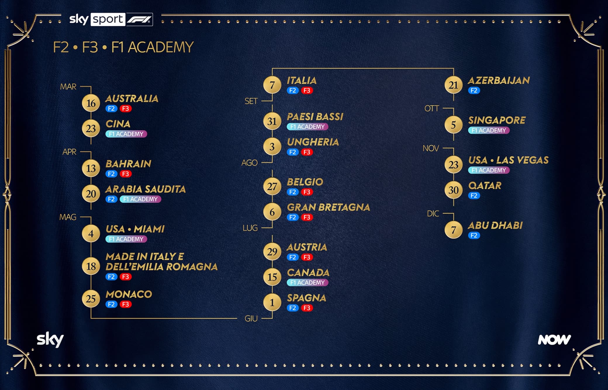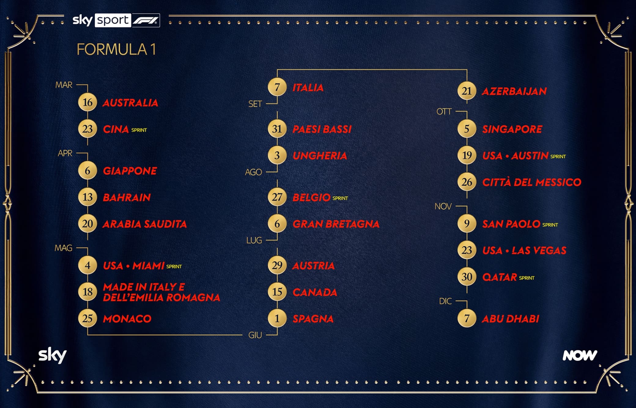 La partenza del Mondiale sarà a Melbourne, in Australia, nel weekend del 14/16 marzo; poi due volte in Italia (a Imola il 18 maggio e a Monza il 7 settembre) e il gran finale ad Abu Dhabi nel fine settimana del 5/7 dicembre, per un totale di 30 spettacolari appuntamenti, 24 gare più 6 Sprint Race. Un giro del mondo senza lasciare la Casa dello Sport, con un unico punto di partenza: il Remote Garage di Sky Sport Formula 1, che quest’anno si evolve ulteriormente e diventa 2.0, potendo offrire alla Squadra Motori di Sky Sport una serie di innovativi supporti che vanno al di là delle immagini, dei dati e delle grafiche, diventando un vero e proprio "hub" di collegamento tra la pista e il telespettatore, sempre più al centro delle emozioni della gara.