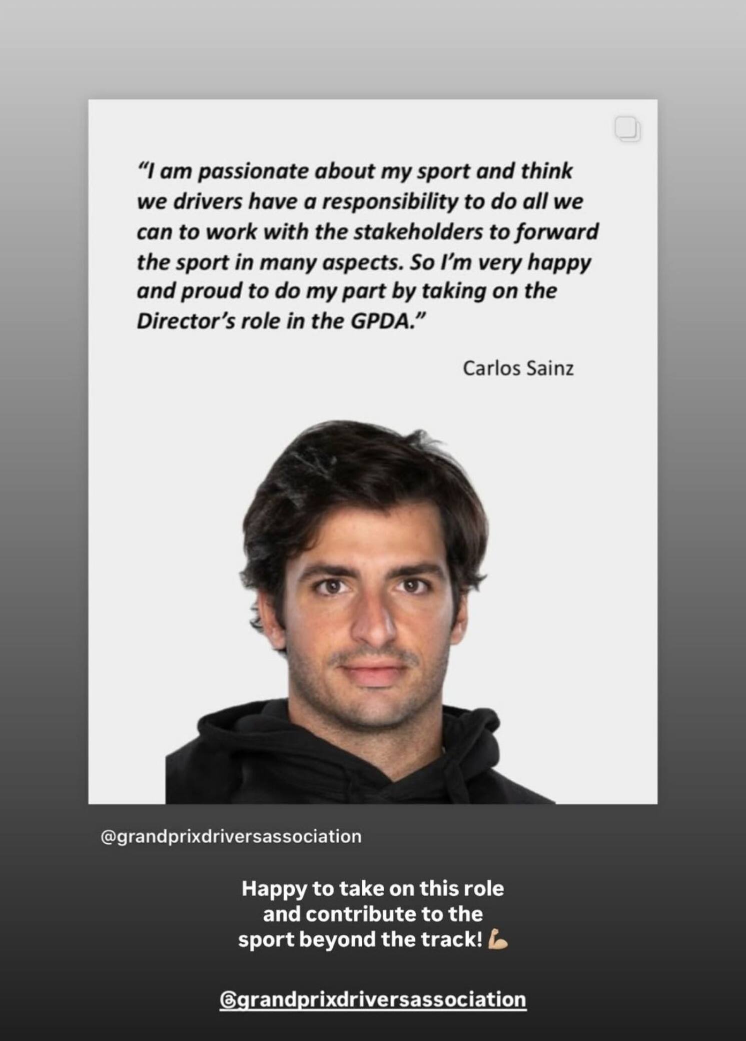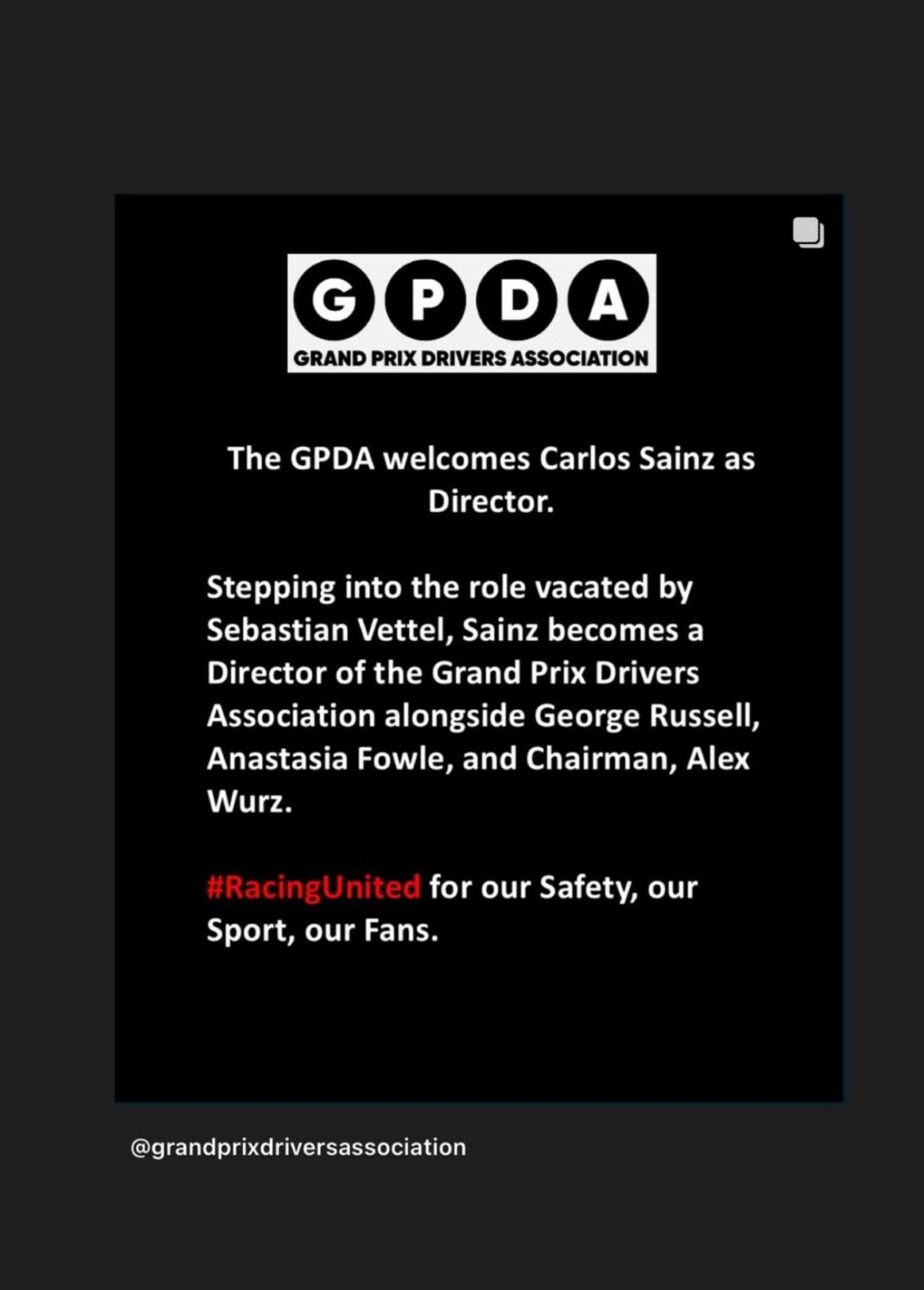 La GPDA - Grand Prix Drivers’ Association - ha annunciato l'ingresso di Carlos Sainz nel ruolo di nuovo Direttore dell'organizzazione. Il pilota spagnolo della Williams ed ex Ferrari, prenderà il posto lasciato vacante da Sebastian Vettel. Con George Russell, Anastasia Fowle e al Presidente Alex Wurz sarà alla guida dell'associazione che rappresenta i piloti di F1. In una storia su Instagram è poi arrivato il messaggio dello stesso Sainz: "Sono appassionato del mio sport e penso che noi piloti abbiamo la responsabilità di fare il possibile per collaborare con gli stakeholder e far progredire il motorsport in molti aspetti. Sono perciò molto felice e orgoglioso di dare il mio contributo nel ruolo di Direttore della GPDA".