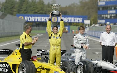 Una foto particolare e oggi ancora più suggestiva. Qui Eddie Jordan è accanto a Giancarlo Fisichella il 18 aprile 2003: la coppa della vittoria ottenuta dal pilota italiano a Interlagos consegnata sulla pista di Imola.