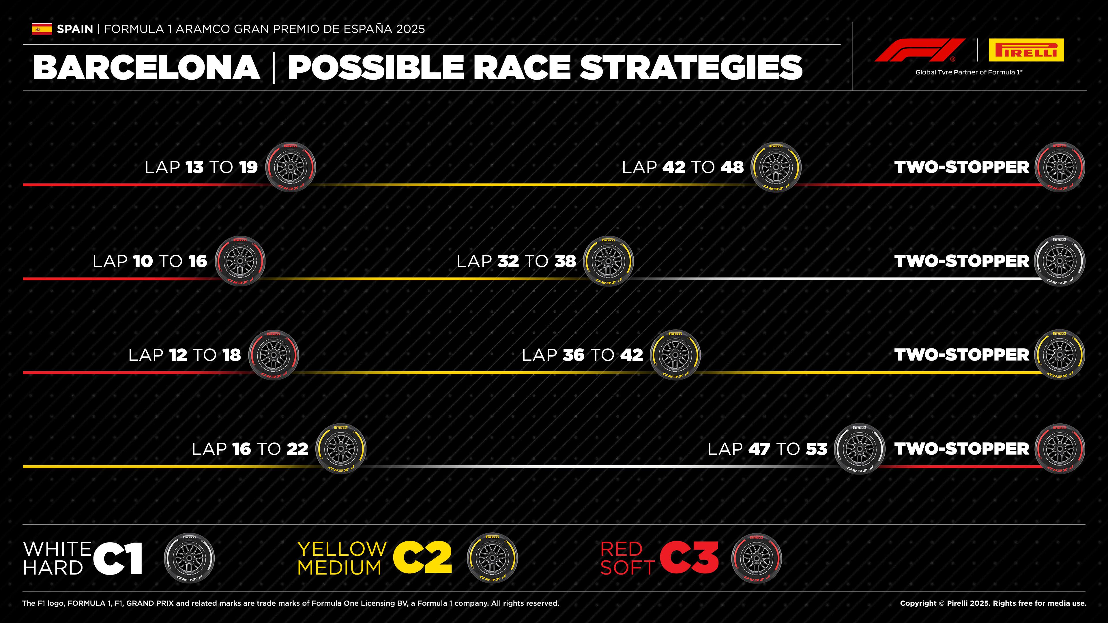 Nona gara del Mondiale, McLaren dalla prima fila e condizioni meteo che potrebbero avere un ruolo molto importante a Barcellona per le temperature elevate. Queste le premesse del GP di Spagna, per il quale Pirelli indica la doppia sosta come approccio strategico più plausibile ed efficace: lo schema soft - medium - soft dovrebbe essere quello prioritario secondo il fornitore unico.
