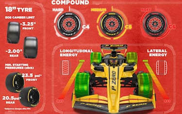 - Per la terza volta nella stagione sarà protagonista il tris di mescole più morbido della gamma. Torna quindi la C6, già usata a Imola e a Monte Carlo, in compagnia delle C5 (Medium) e C4 (Hard). Si tratta quindi di uno step più morbido in confronto a quanto accaduto un anno fa, quando le tre mescole selezionate furono C3, C4 e C5. Si tratta di una nuova opportunità di utilizzare la nuova C6 e di sfruttarla al meglio sulla base delle informazioni e dei dati raccolti nelle due precedenti esperienze.