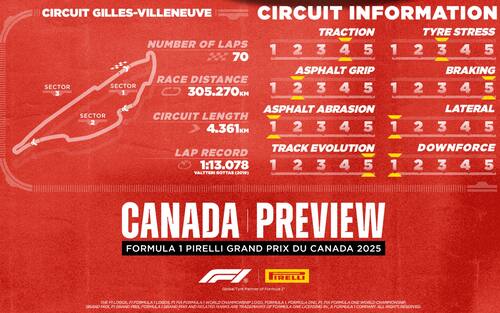 - Il Circuit Gilles Villeneuve è una pista dove le forze laterali esercitate sui pneumatici sono medio basse; un po' più intense quelle longitudinali ma comunque non particolarmente elevate. L'asfalto è stato rifatto nel 2024, ma ha mantenuto le caratteristiche di bassa rugosità e aderenza ridotta, risultando molto liscio e poco abrasivo. Il graining, soprattutto nelle prove libere del venerdì, potrebbe farsi vedere ma con il progressivo gommarsi del manto stradale non dovrebbe essere un fattore.