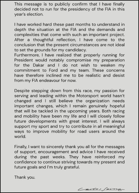 E poi un messaggio d'amore per questo sport, il suo sport: "Nonostante il mio passo indietro da questa corsa, la mia passione per il motorsport e per il desiderio di servire e guidare questo mondo non è cambiata. Credo ancora che l'organizzazione abbia bisogno di cambiamenti importanti, e rimango sinceramente fiducioso che questi verranno affrontati nei prossimi anni. Le corse e la mobilità sono la mia vita, e seguirò con grande interesse gli sviluppi futuri. Continuerò sempre a sostenere il mio sport e a cercare di contribuire concretamente a migliorare la mobilità per gli utenti della strada in tutto il mondo".
